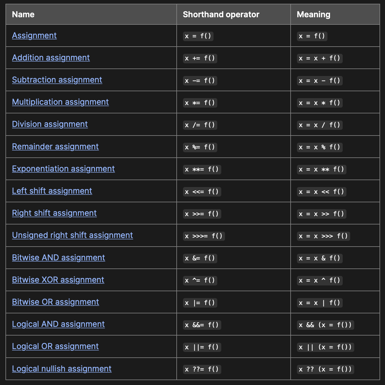 Assignment operators, assign value to its left and right operand. A simple assignment operator is the equal sign, but there are much more versions that can be used.