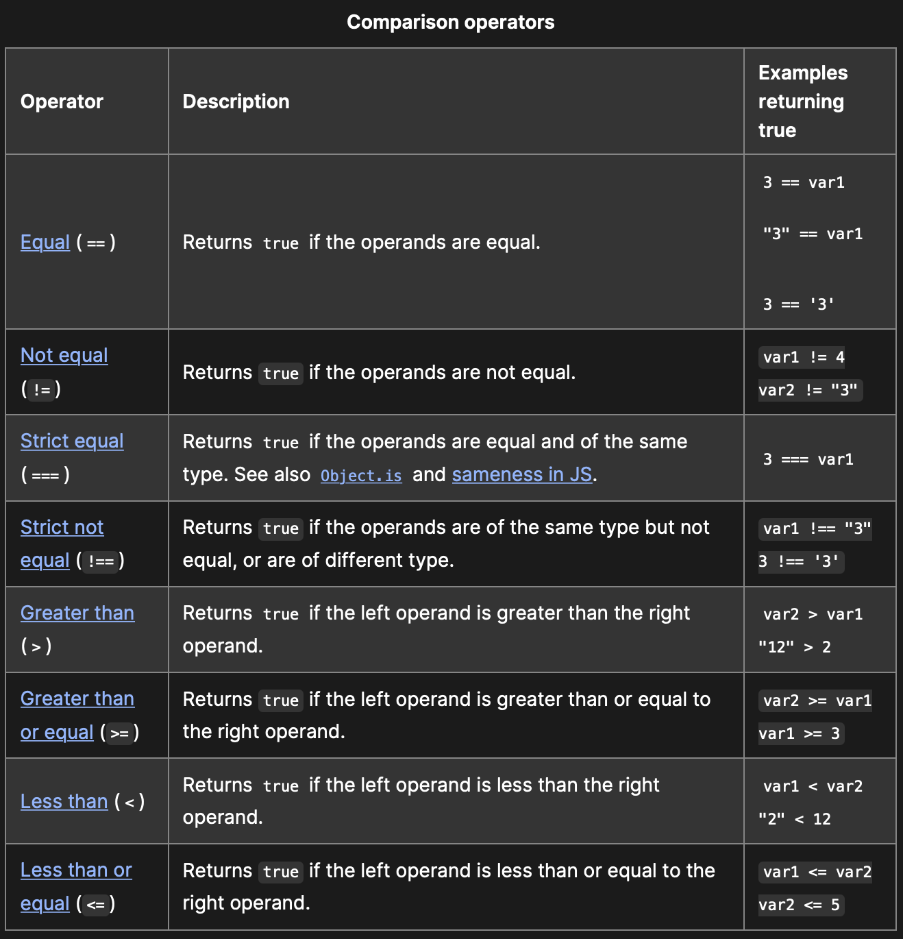 A comparison operator compares its operands and returns a logical value based on whether the comparison is true. The operands can be numerical, logical, string, or object values.