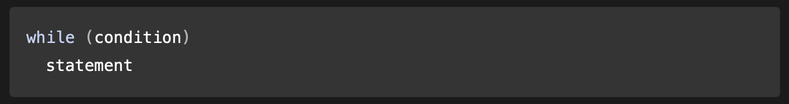 The condition test occurs before statement in the loop is executed. If the condition returns true, statement is executed and the condition is tested again. If the condition returns false, execution stops, and control is passed to the statement following while.